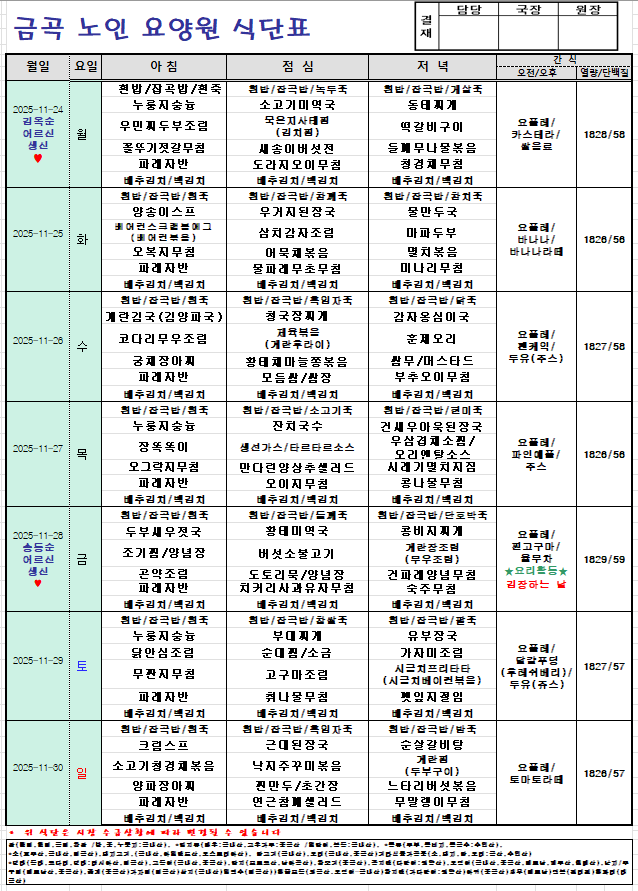 2025년 11월24일~11월30일 주간식단표입니다.