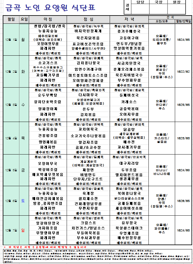 2025년 12월 1일~12월 7일 주간식단입니다.