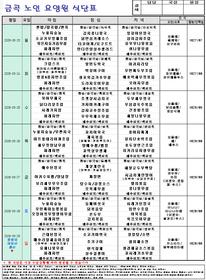 2026년 3월 23일 ~3월 29일 주간식단입니다.