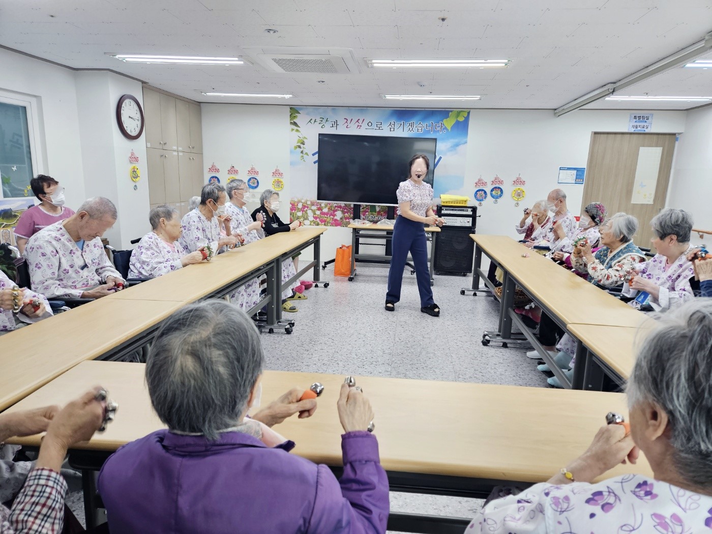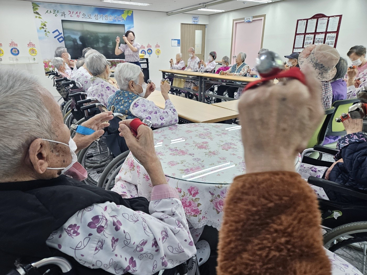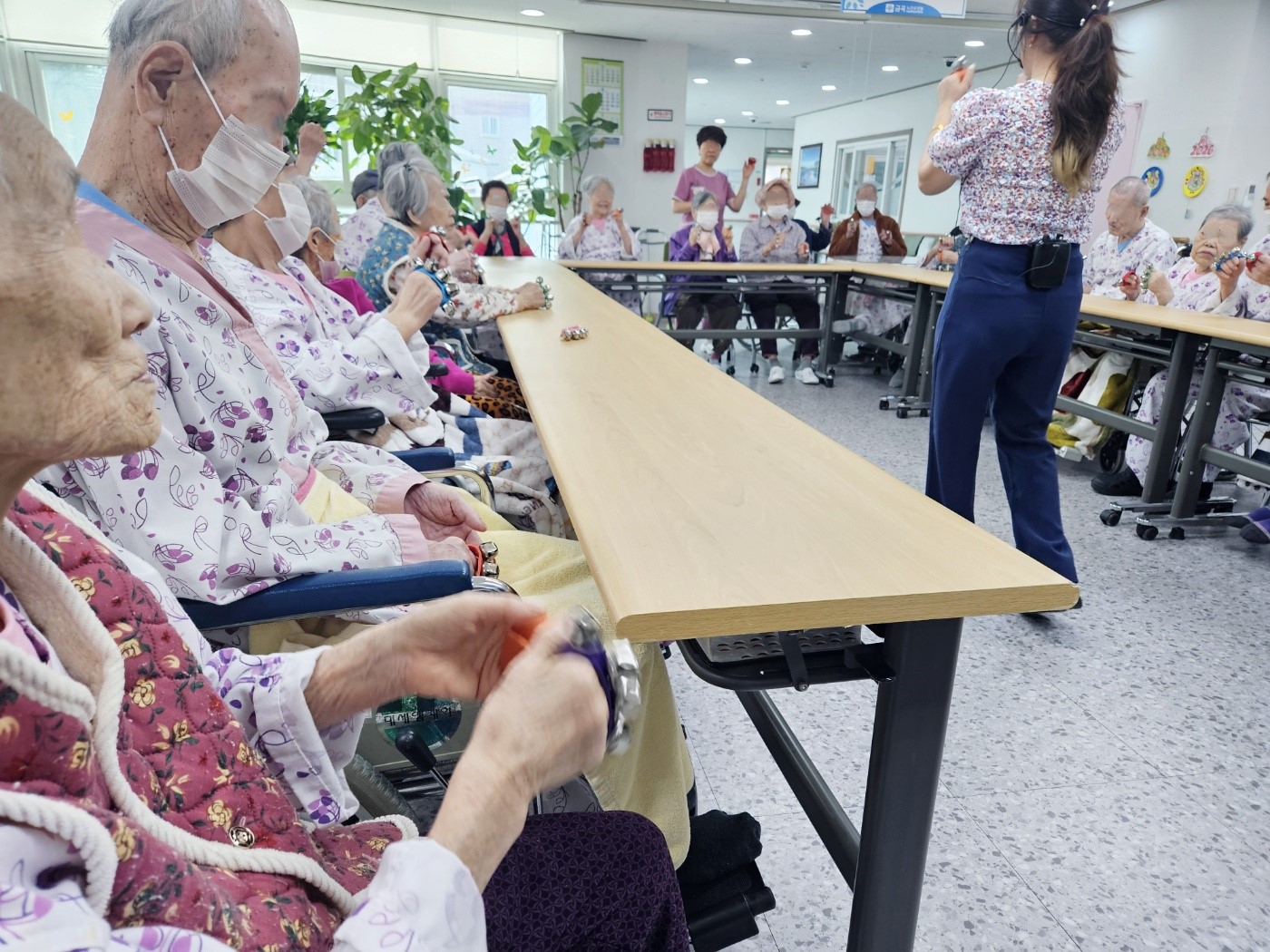 음악에 맞춰 손목벨 악기연주를 하면서 신체활동까지 진행했습니다~