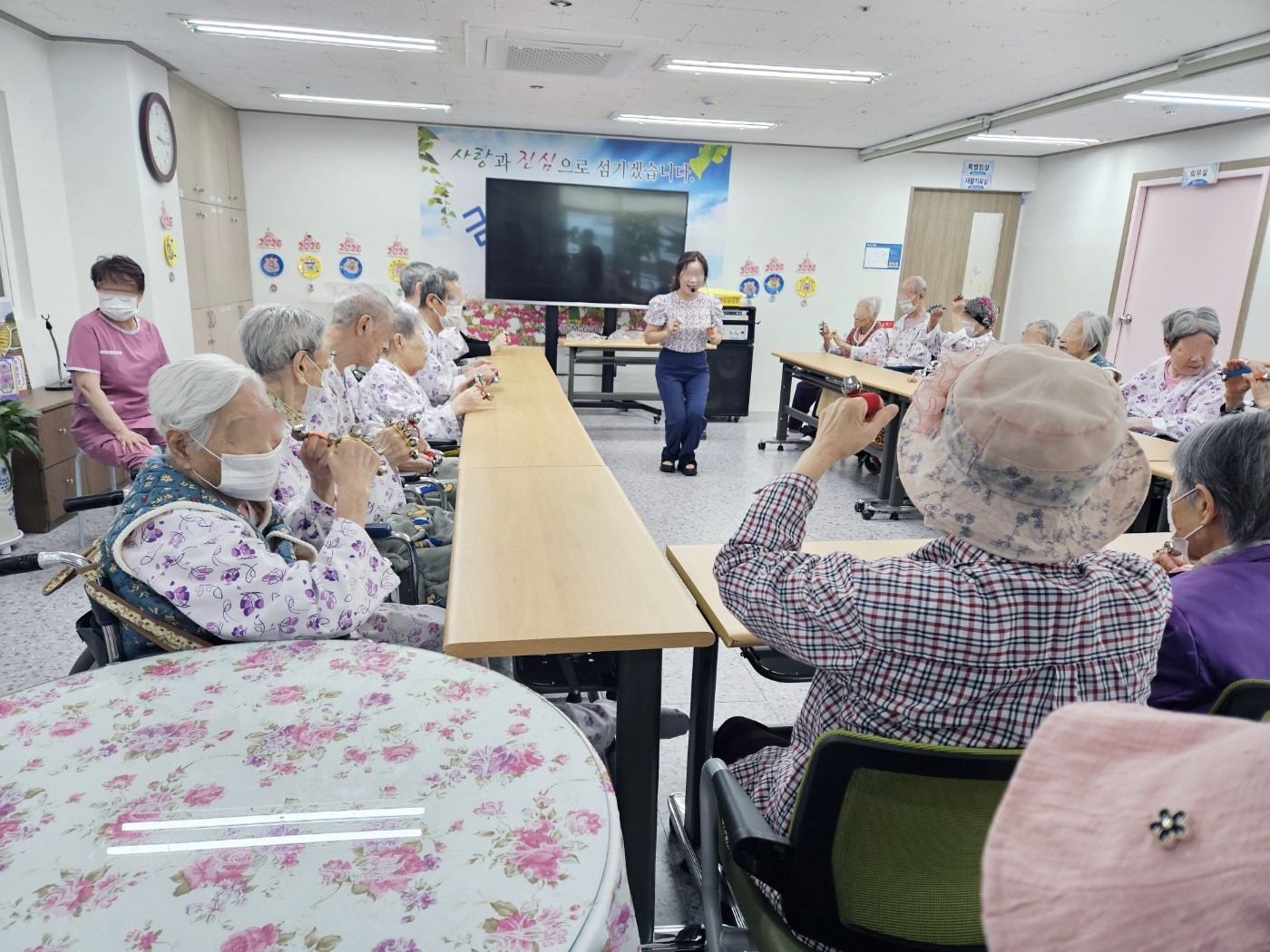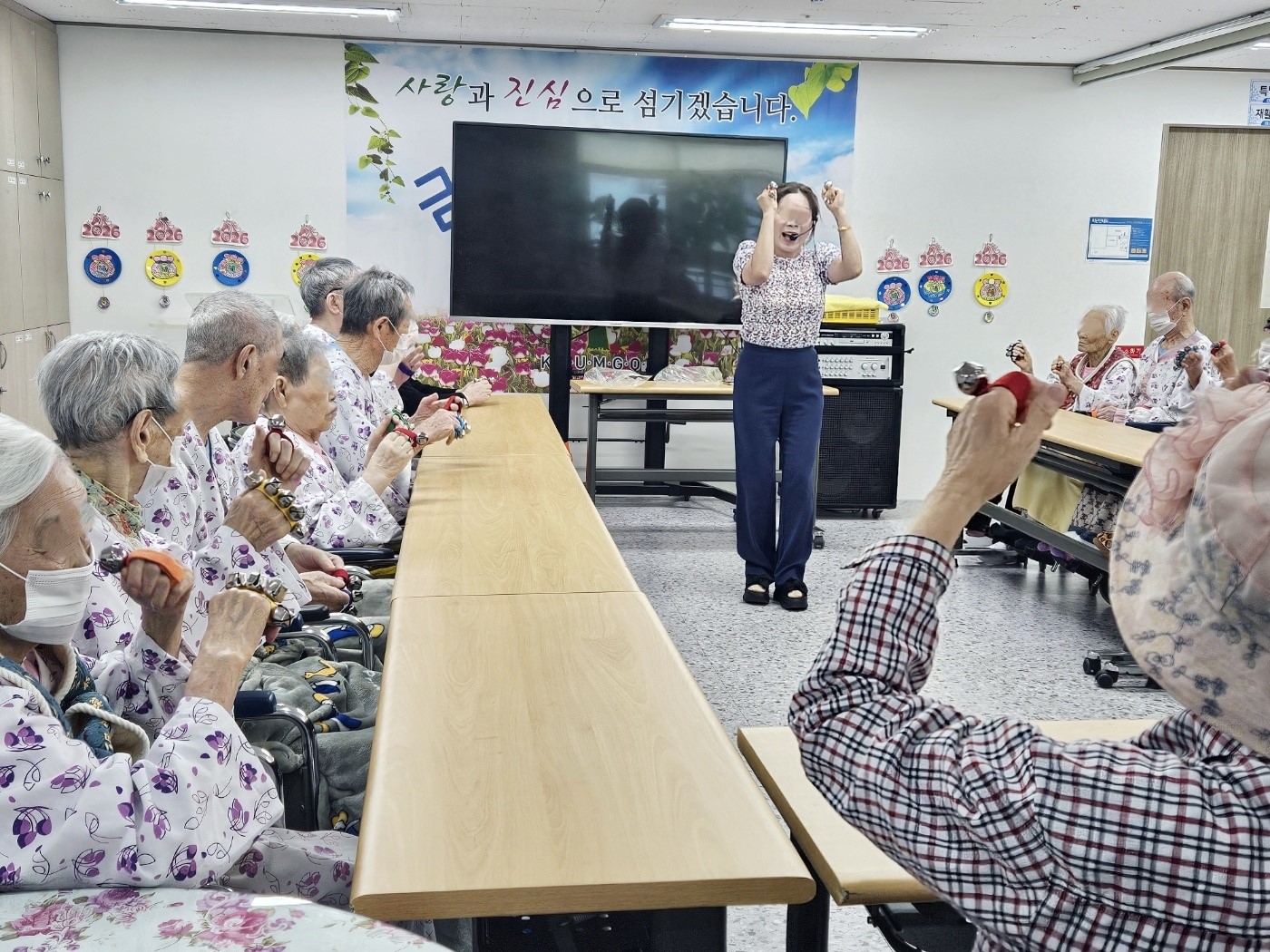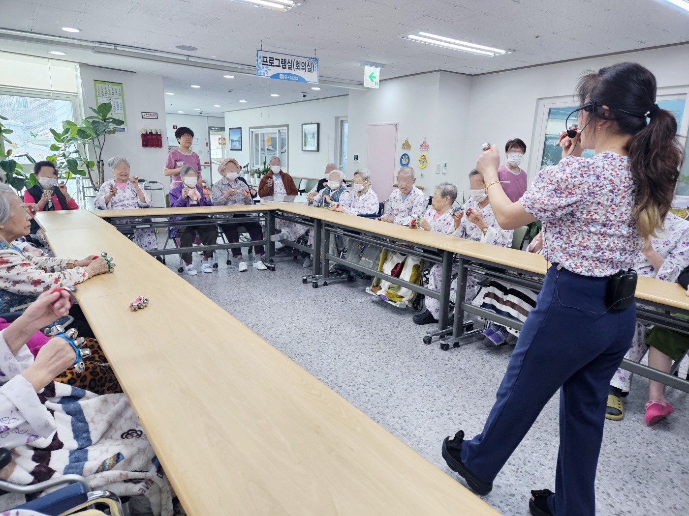 음악에 맞춰 손목벨 악기연주를 하면서 신체활동까지 진행했습니다~